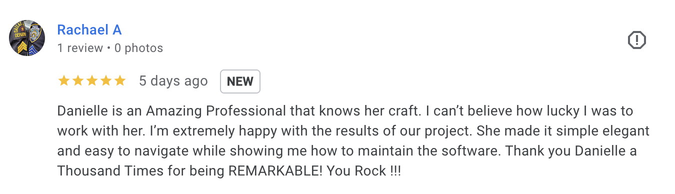 The communication throughout the entire process was exceptional! She took the time to understand my needs and preferences, ensuring that the automation process aligned perfectly with my business goals. What truly sets Danielle’s consulting apart was her thoughtful inclusion of instructional videos in our collaboration. As a visual learner, this approach was incredibly helpful and made the entire process intuitive and easy to grasp. I wholeheartedly recommend Danielle to anyone seeking to optimize their operations and enhance their business capabilities. Her attention to detail and dedication to exceeding my expectations were evident every step of the way!”